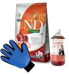 Farmina N&D Pumpkin Grain Free canino BOAR AND APPLE ADULT MEDIUM & MAXI 12kg & LAB V Olio di salmone per cani e gatti 1000ml + Guanto per pettinare il pelo di cane e gatto GRATIS!