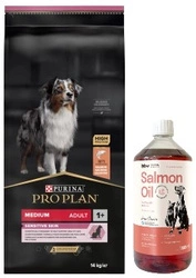 ( Quantità di prodotti: 60 )PRO PLAN Sensitive Skin Medium Adult Cibo per cani ricco di salmone 14 kg & LAB V Olio di Salmone per cani e gatti 1000ml